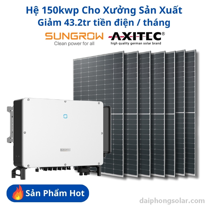 - Công suất lớn, hiệu quả cao: Hệ thống 150kW được thiết kế để cung cấp lượng điện năng lớn, phù hợp cho các nhà xưởng và cơ sở sản xuất có nhu cầu điện liên tục.