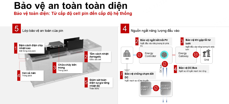Ngoài ra, hệ thống được bảo vệ với 4 lớp ngăn chặn rủi ro an toàn từ nhiều nguồn năng lượng khác nhau, bao gồm bảo vệ chống chạm đất DC, bảo vệ ngắt kết nối hệ thống năng lượng mặt trời (PV), bảo vệ khi gặp lỗi từ lưới, và bảo vệ DC Bus.